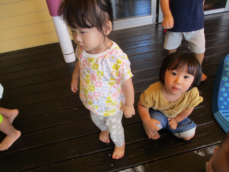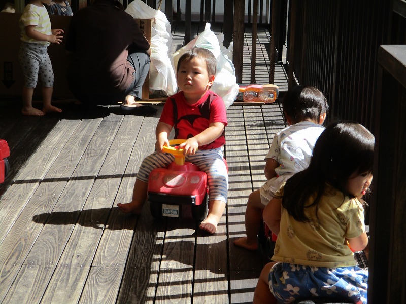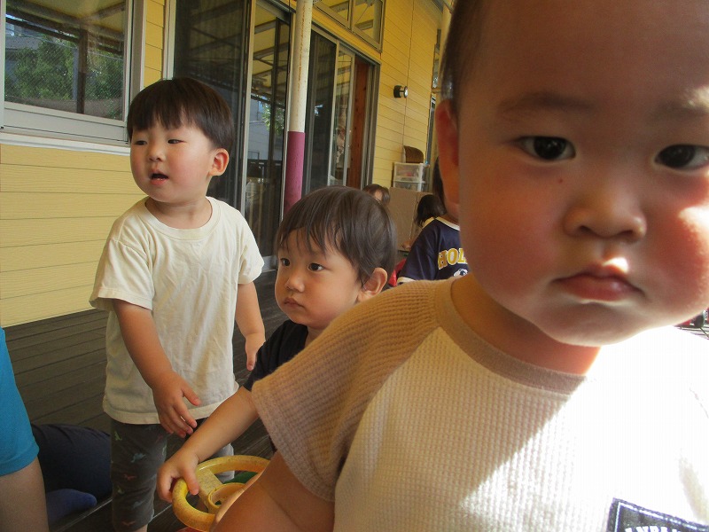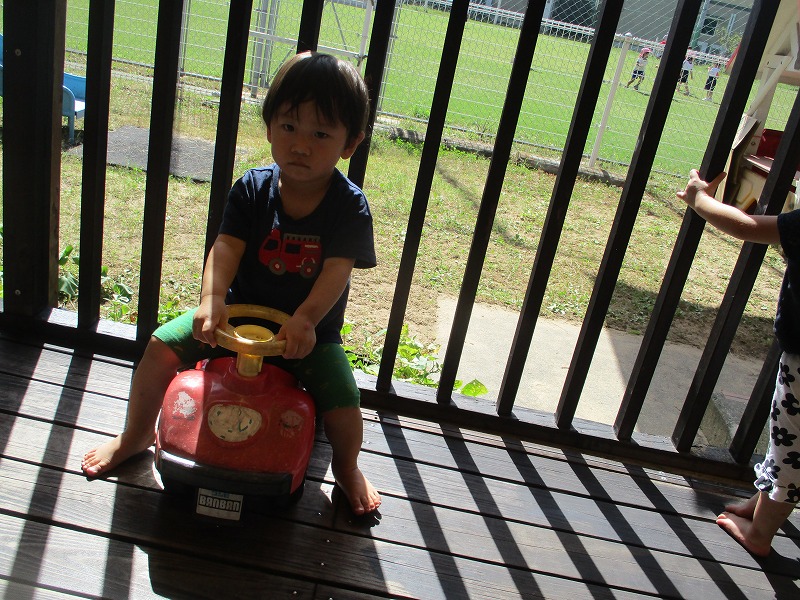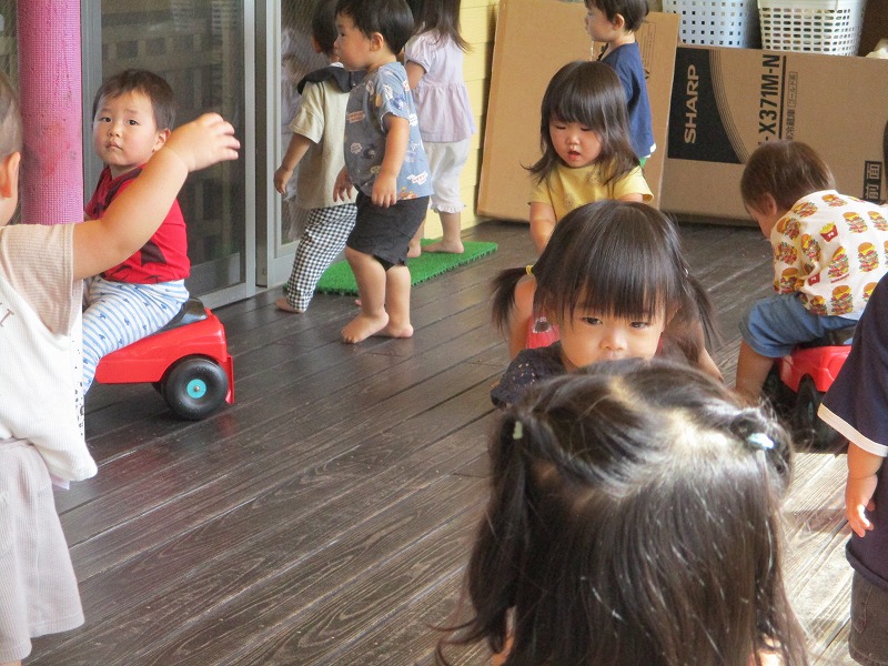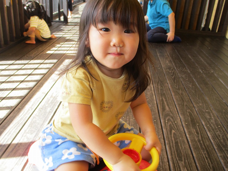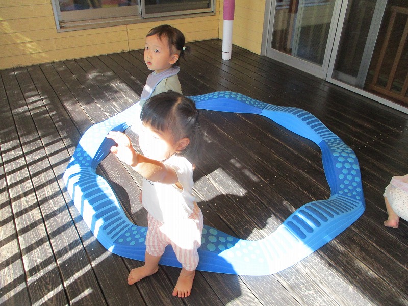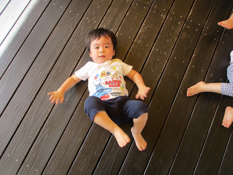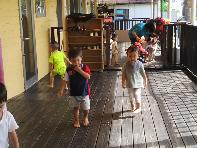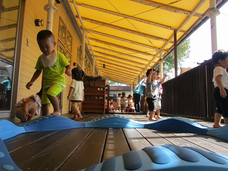 テラスの床板が太陽の日差しで温められ、子どもたちが歩くたびに「アッチアッチ」と言い保育教諭とやりとりを楽しみながら過ごしました。☀️☀️