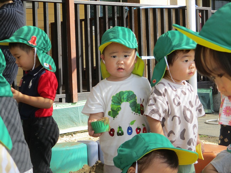 気候も涼しくなり戸外に出て遊ぶことも増え秋の自然物を見たり、触れたりしながら活動しています。