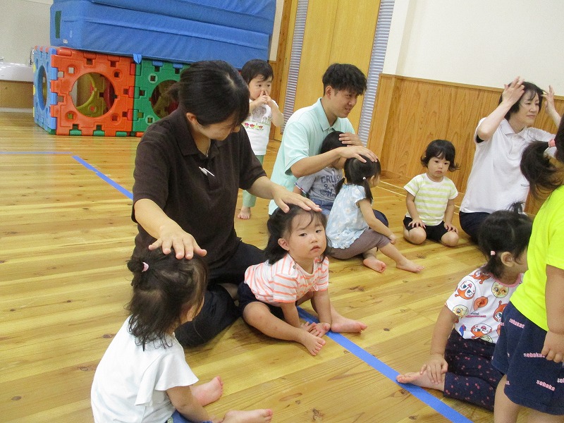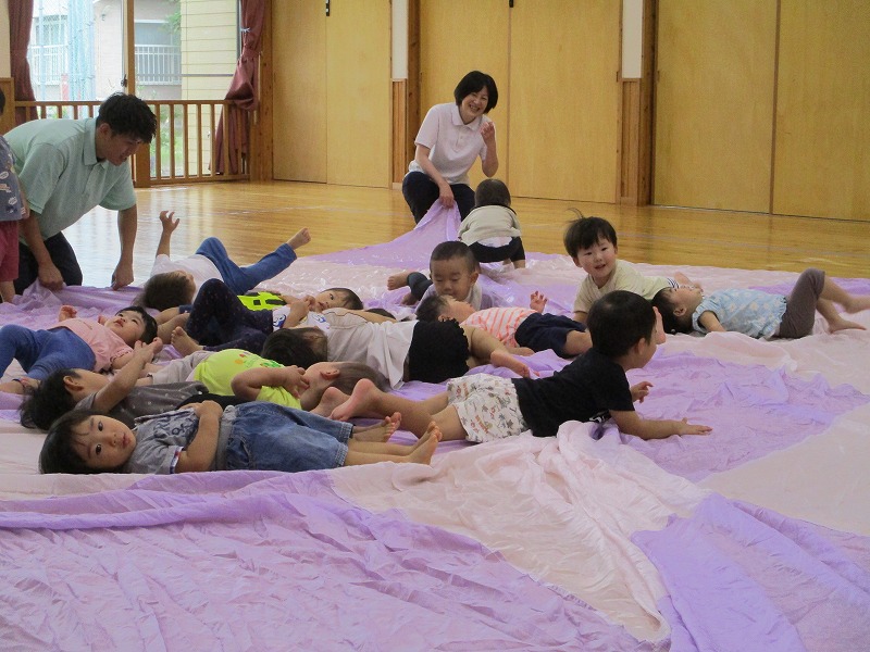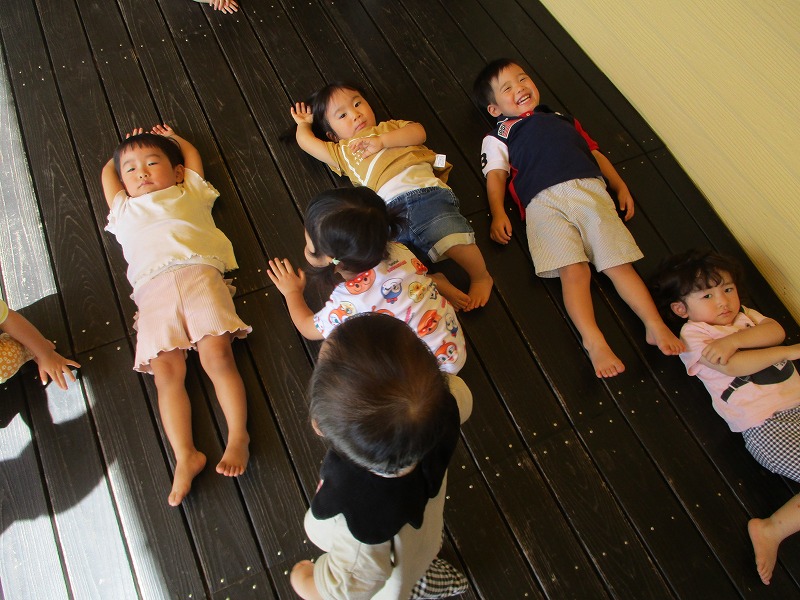 日陰に集まり保育教諭が「ゴローン」という寝転ぶ子ども達