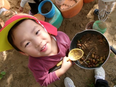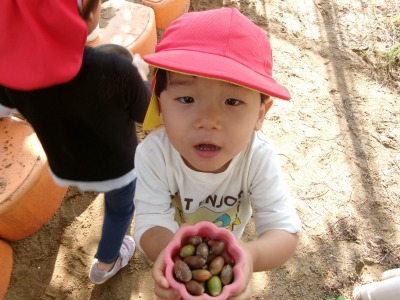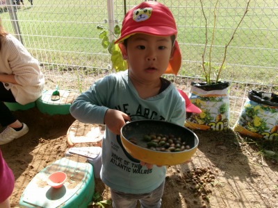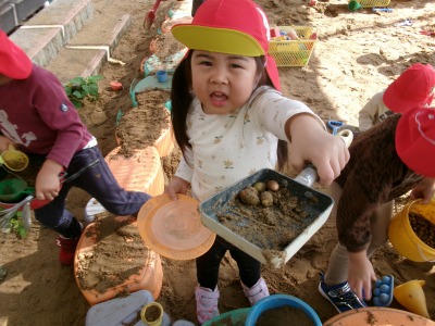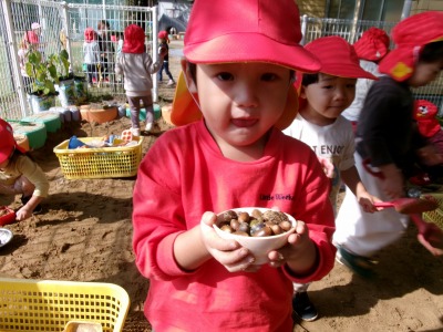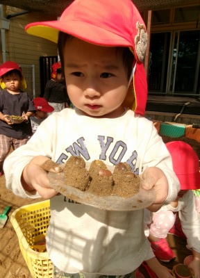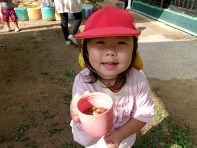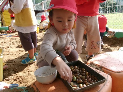 やっと秋がやってきて、子どもたちも園庭にたくさん落ちているどんぐりに大喜びです。ケーキを作ったり、たこ焼きを作ったり、見立て遊びを楽しむ中で、友達との関わりも増えてきました。