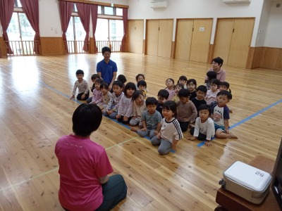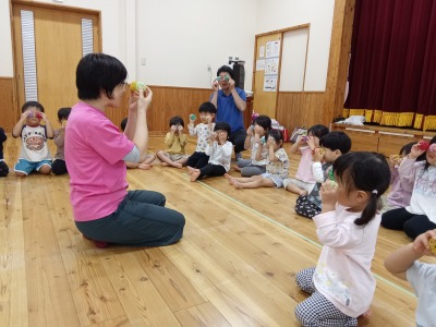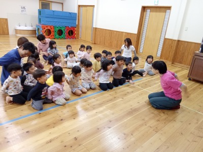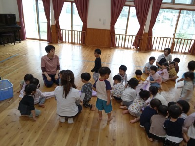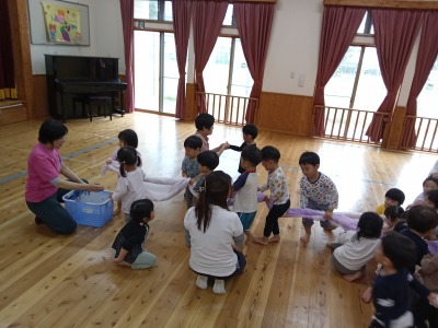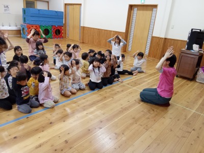 そして、先日行われて「ミュージックケア」淺見先生と楽しい時間を過ごすことができました。自分の体の前後、左右、上下を認識していくことで、ボディイメージがつき、友達との距離感や力の強さなどを知っていくことができるそうです。