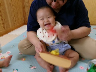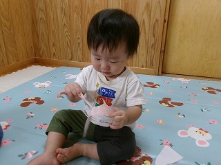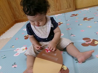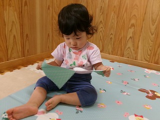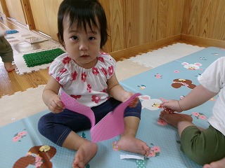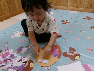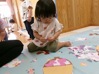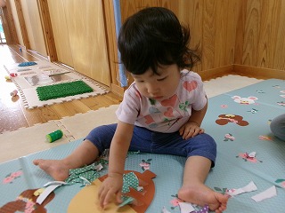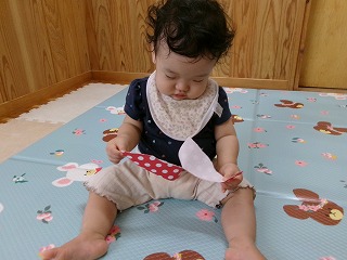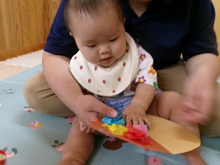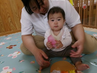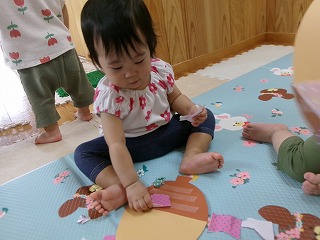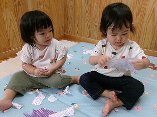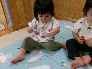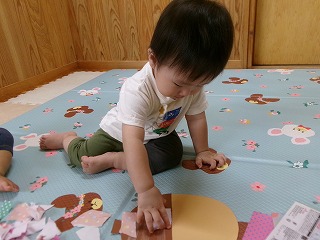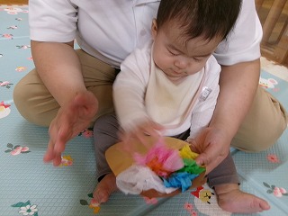 月齢の低い子どもたちはお花紙をクシャクシャにしました。