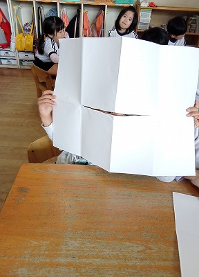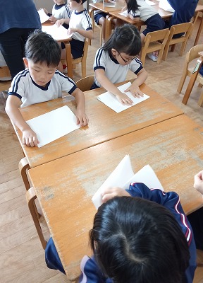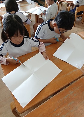 まずは画用紙を折って・・・画用紙の端と端をしっかり合わせています、