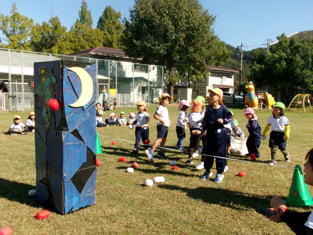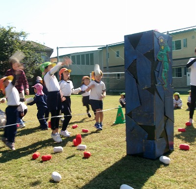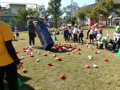 異年齢の色別チーム対抗です。必死に投げる子どもたち。