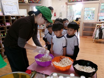 ポップコーンを落とさないように大事に食べる子どもたち。