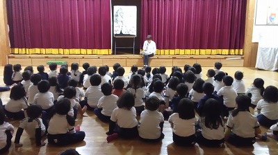 大きな紙芝居の迫力に圧倒され、みんな見入っていました。