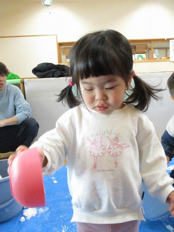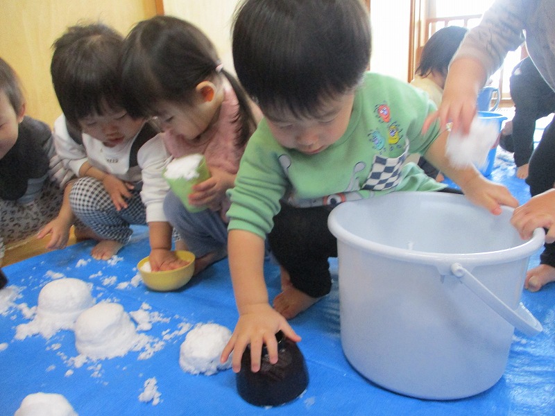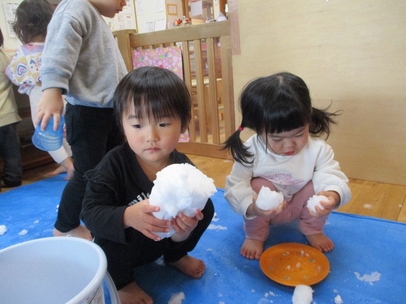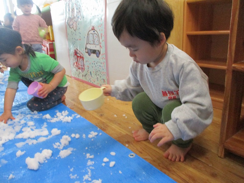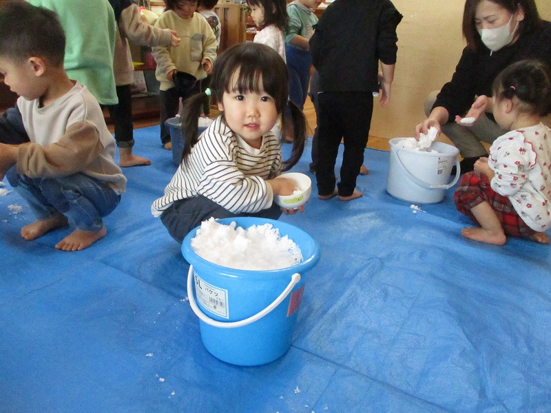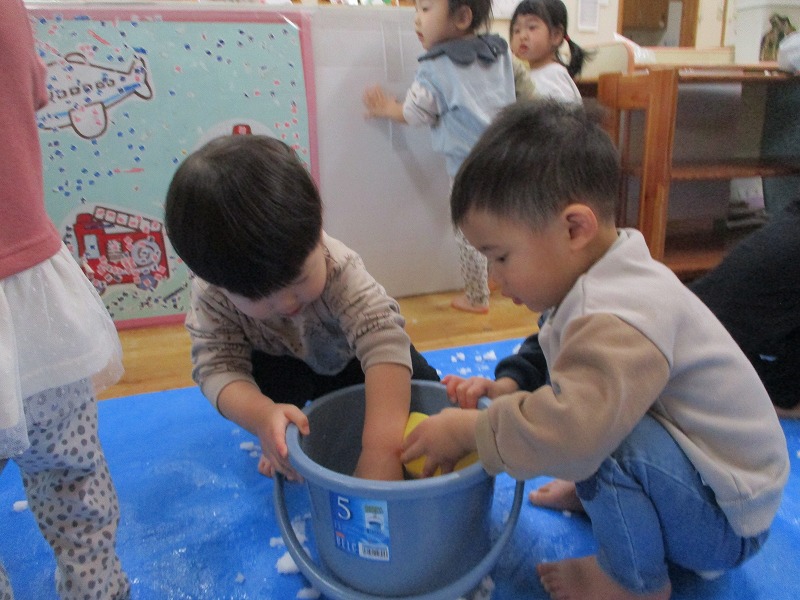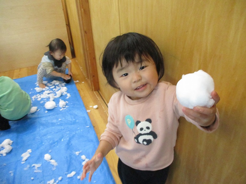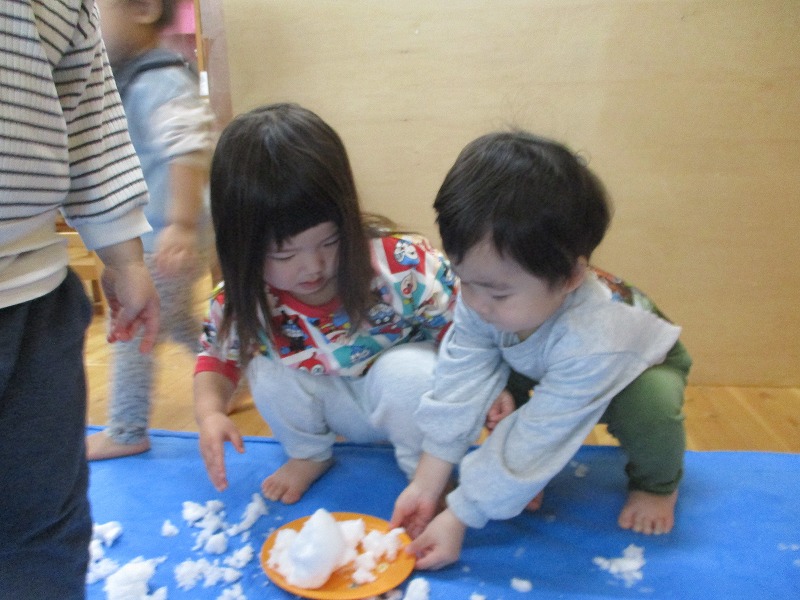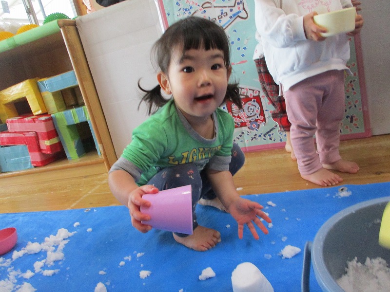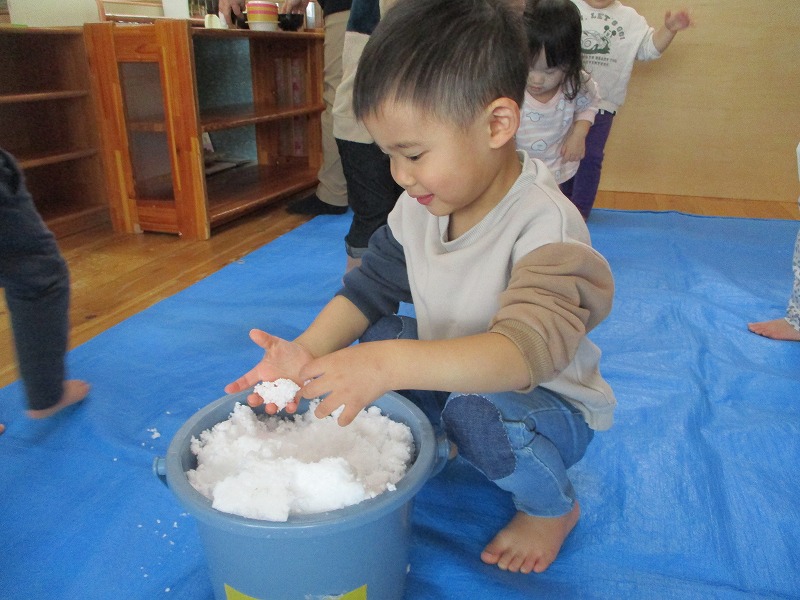 この日は天候が悪く外に出る事はできませんでしたが室内に雪を持って入りみんなで触って遊びました。