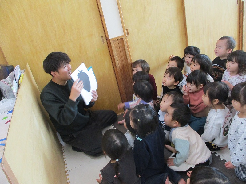 先生の問いに「りんご」「バナナ」「ねこ」「アンパンマン」など元気よく答えている子どもたち