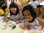 給食の様子です。離乳食、1.2歳児食と個々に合わせた食事の形態となっています。手づかみやスプーンを使ってたべたり、必要に…続きを読む